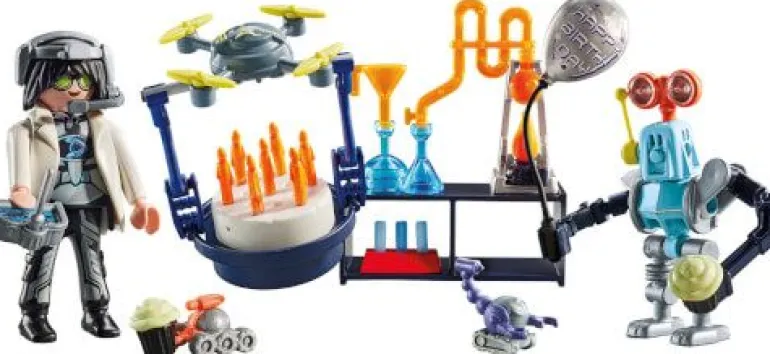 Figuren: 1 Mann; Zubehör: 1 Headset, 2 Reagenzgläser, 1 Trichter, 1 Drohne, 1 Luftballon, 3 Roboter, 1 Regal, 1 Fernbedinung, 1 Torte
