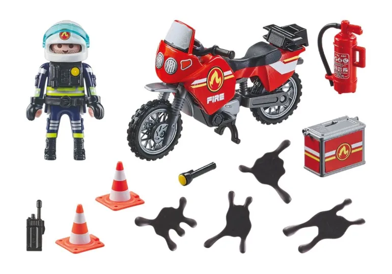 Mit dem PLAYMOBIL-Spielset Feuerwehrmotorrad am Unfallort werden Kinder zu echten Rettungsheldinnen und -helden! Der Feuerwehrmann navigiert mit seinem wendigen Motorrad durch den Verkehrsstau und sichert die Unfallstelle mit Pylonen.