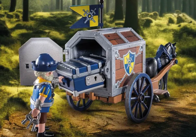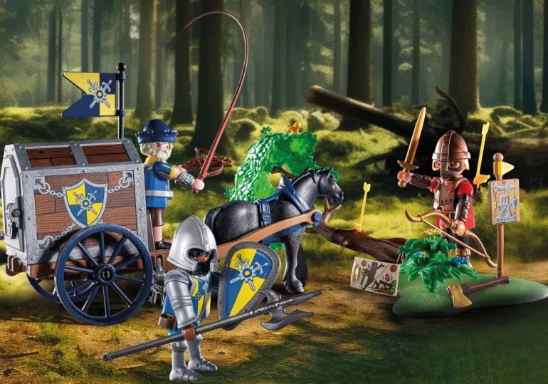 „Die Ritterspielwelt Novelmore von PLAYMOBIL steckt voller Überraschungen: In ihrem Transportwagen haben die Ritter von Novelmore nicht nur geheime Baupläne, sondern auch Drachengold geladen. Auf diese wertvolle Fracht haben es die Burnham Raiders abgesehen und fällen einen Baum, um den Transportwagen zu stoppen. Doch die Novelmoreritter werden alles tun, um ihr Eigentum zu verteidigen.
