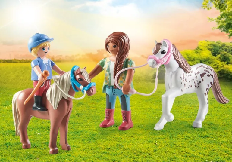 „Figuren: 1 Frau, 1 Kind; Tiere: 2 Ponys