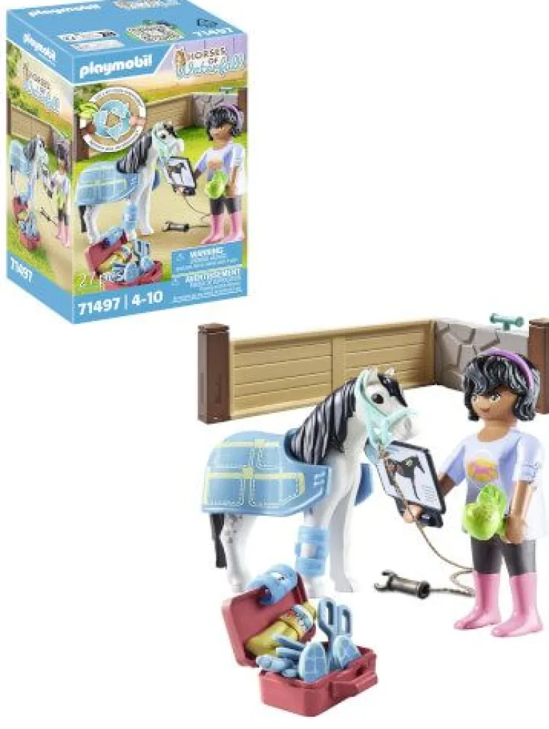 „Kümmere dich um die Ponys auf der Waterfall Ranch mit der Pferde-Therapeutin von PLAYMOBIL. Vorsichtig untersucht die Tiertherapeutin das Pferd, um herauszufinden, was los ist. Die Fessel scheint verletzt zu sein. Die Therapeutin bringt eine Bandage an und streichelt das Tier beruhigend. Bald wird alles wieder gut.