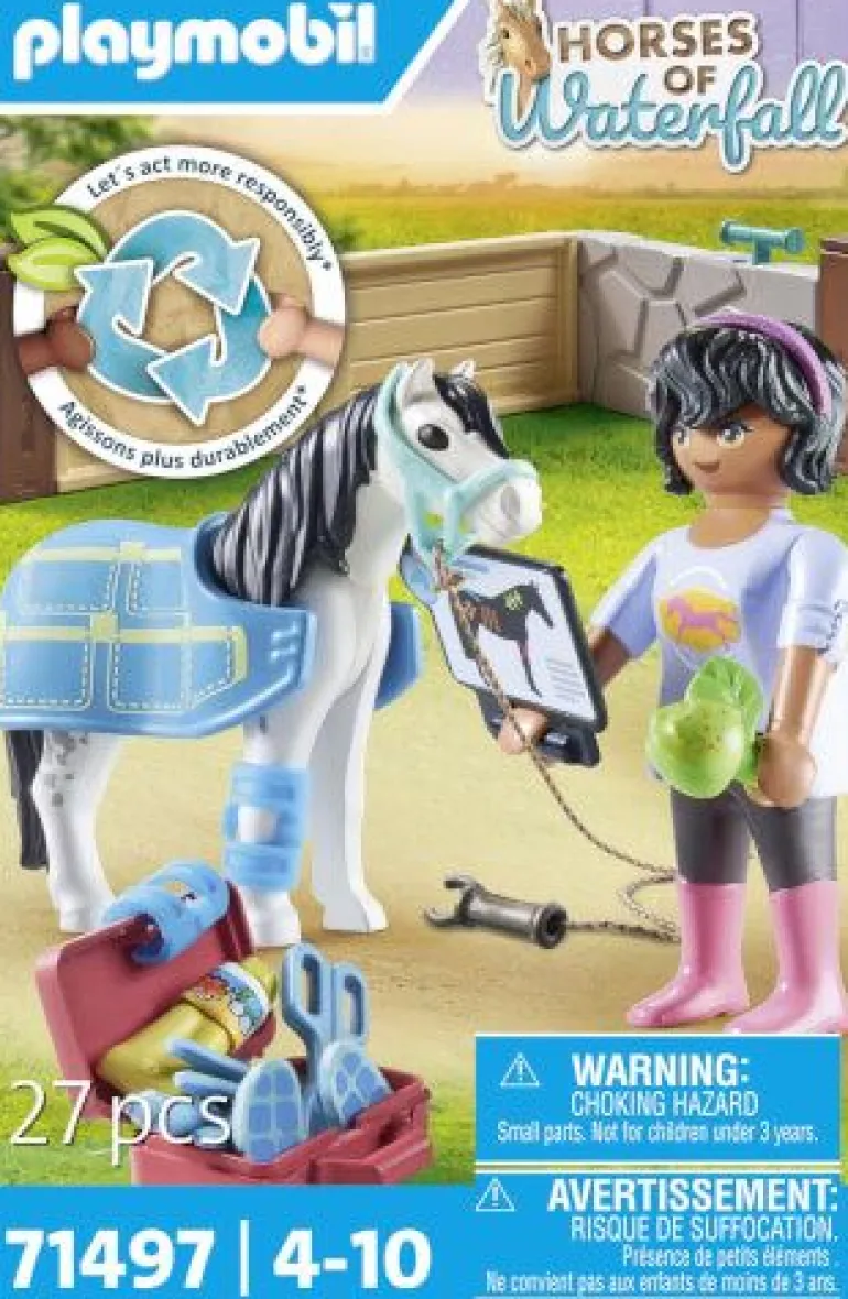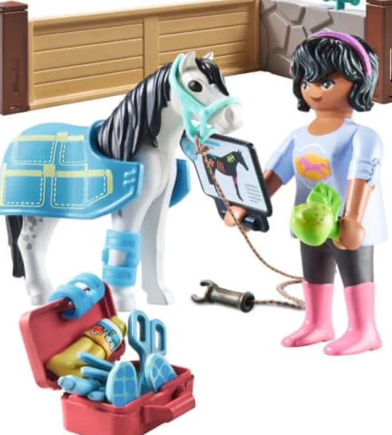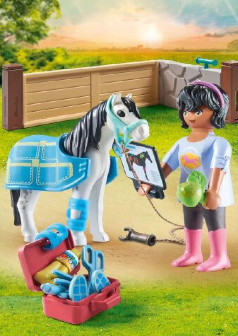 Figuren: 1 Frau; Tiere: 1 Pony; Zubehör: 1 Pferdedecke, 2 Bandagen, 1 Halfter, 1 Seil, 1 Apfel, 1 Koffer mit Zubehör, 1 Klemmbrett