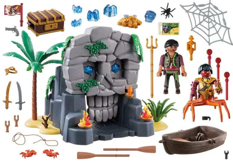 Figuren: 1 Pirat, 1 Krabbenmann; Tiere: 2 Krebse, 1 Spinne; Zubehör: 1 Fels, 1 Schädel in Felsoptik, 1 Kristallschädel,2 Kristalle, 2 Bodenplatten, 1 Palme, Pflanzen, 2 Feuerschalen, 1 Flamme, 2 Säbel, 1 Dreizack, 1 Dolch, 1 Karte, 2 Kanonen, 3 Geschosse, 1 Spinnennetz, 1 Boot, 1 Fahne, 1 Lampe, 2 Ruder, 1 Hut mit Anstecker, 1 Schnurr, 1 Ast, 1 Krone, 1 Truhe, 1 Goldschatz mit Kristallen, 1 Pistole