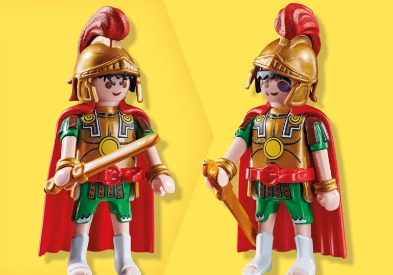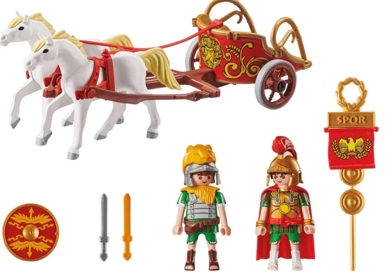 In seinem römischen Streitwagen ist Brutus zu allem bereit, um die Macht zu übernehmen. Figuren: Senator Brutus, 1 römischer Soldat; Tiere: 2 Pferde; Zubehör: 1 Streitwagen mit Pferdegeschirr, 2 Helme, 1 Löwenkopf, 1 Schild, 1 Standarte, 2 Schwerter, 2 Armreifen, 1 Umhang