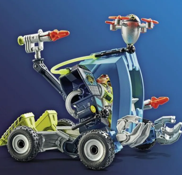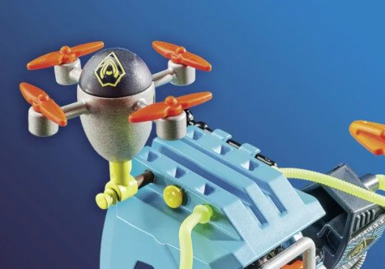 Figuren: 2 Männer; Zubehör: 1 Helm mit Visier, 1 Helm mit Headset, 3 Kanonen, 3 Schläuche, 1 Fluggleiter mit Schussfunktion inkl. zwei Geschossen, 2 Düsen mit Feuer, 1 beweglicher und fahrbarer Roboter mit diversen Schussfunktionen inkl. 2 Geschossen, 1 Drohne