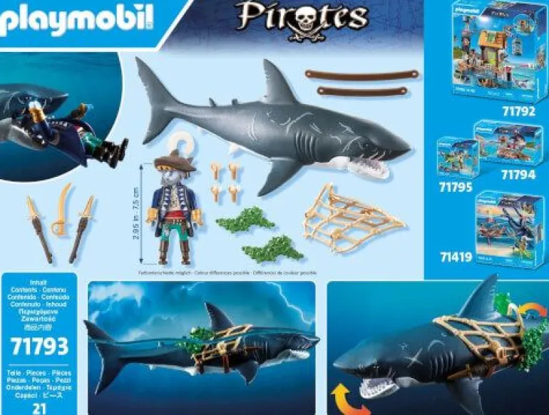 In den tiefen Gewässern der Piratenwelt lauern ein monströser Riesenhai und ein ruchloser Hai-Pirat! Durch einen Hebelzug öffnet sich das riesige Maul des Hais, in dem ein Pirat gefangen werden kann. Schnell wieder losgelassen, schließt sich das Maul automatisch. Auf seinem Ritt durch die sieben Weltmeere hält sich der Hai-Pirat mit gezücktem Säbel an dem Netz des Monsterhais fest. Der Riesenhai kann im Wasser schwimmen.
