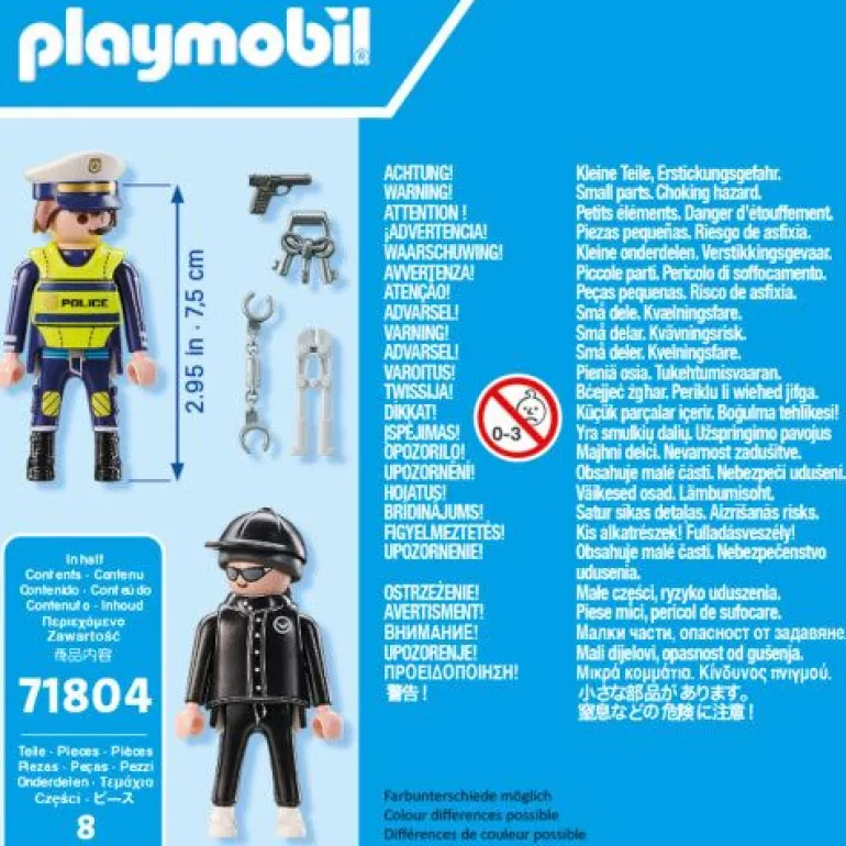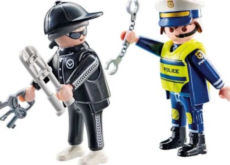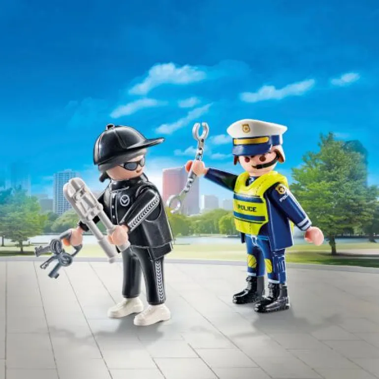 PLAYMOBIL DuoPack Polizist und Einbrecher. Der Polizist mit Waffe und Handschellen erwischt einen Einbrecher auf frischer Tat.