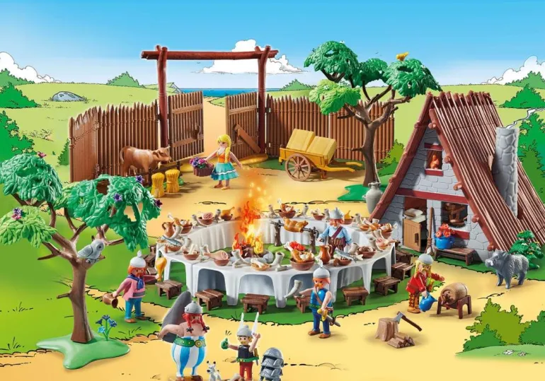 Das PLAYMOBIL-Set enthält die berühmten Gallier Asterix, Obelix und Hund Idefix, vier Dorfbewohner, die Hütte des Asterix mit Einrichtung, eine Festtafel mit Platz für 18 Gallier, einen drehbaren Grillspieß mit Wildschwein und Feuerstelle, einen Hinkelstein, Teller und Geschirr und viele weitere tolle Extras zum Nachspielen spannender Abenteuer mit den unbeugsamen Galliern.