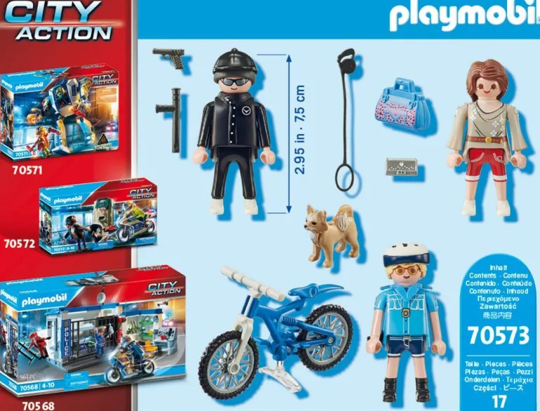 Handtaschenraub! Die Polizistin nimmt mit ihrem Fahrrad die Verfolgung des Taschendiebs auf.