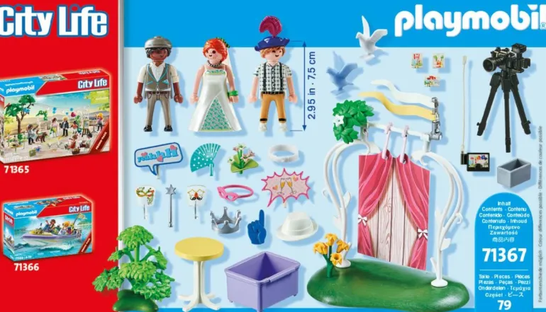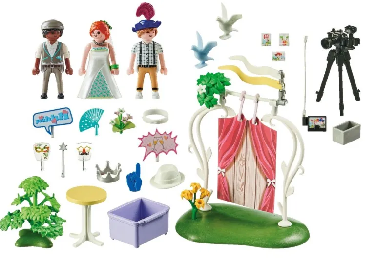 Das Spielzeugset enthält drei PLAYMOBIL-Figuren, eine Fotoleinwand, einen Fotoapparat mit Stativ, einen Stehtisch, einen Monitor und zahlreiche Accessoires zum Verkleiden für lustige Erinnerungsfotos.“ Figuren: 1 Mann, 1 Frau; Zubehör: 1 Blumenstrauß, 12 Blüten, 2 Armreifen, 2 Fahnen, 1 Rettungsreifen, 1 Tasche, 1 Handtuch, 1 Torte, 1 Kübel, 1 Flasche, 2 Gläser
