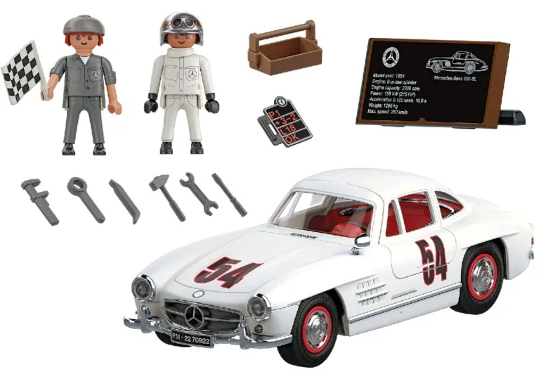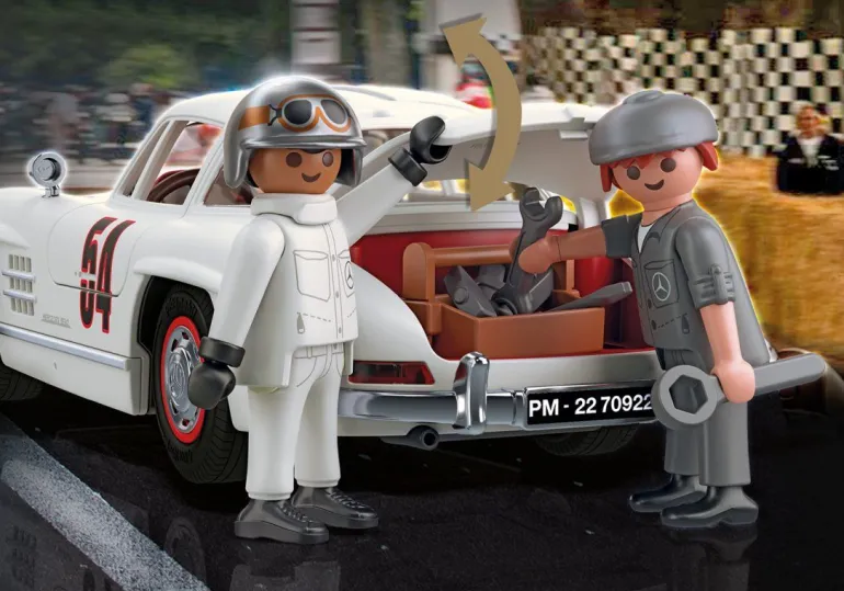 Die Sportwagen-Ikone aus den 1950er Jahren mit den legendären Flügeltüren. Jetzt auch von PLAYMOBIL, ausgestattet mit Figuren und Accessoires in einer Rennsport-Szenerie der 1950er Jahre.