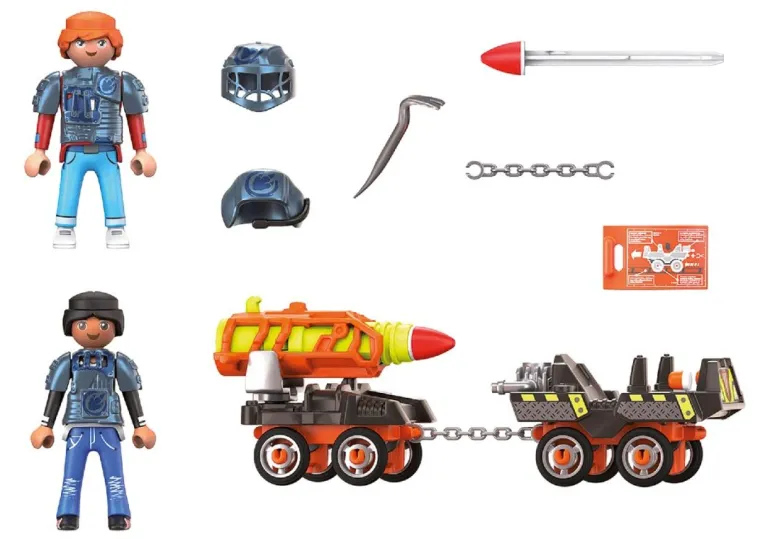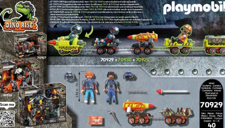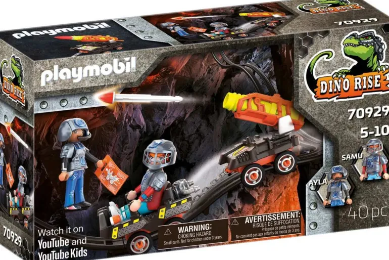 Das Set enthält Ayla und Samu aus Team Dino Rise, ein Raketenkart mit Anhänger und integrierter Kanone, zwei Geschosse, einen Bauplan, Brecheisen und viele weitere Extras für rasanten Spielspaß.