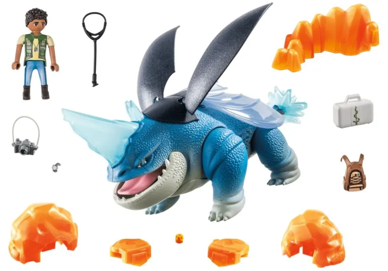 Neben beweglichen Beinen und Unterkiefer besitzt die PLAYMOBIL Plowhornfigur auch aufklappbare Flügelschalen. Werden diese nach oben geklappt, kommen die transparenten Flügel zum Vorschein. Ein kleines Horn auf dem Kopf dient D’Angelo als Fußklemmung zum Reiten. Mit seinem Horn kann Plowhorn den großen Kristall sprengen.