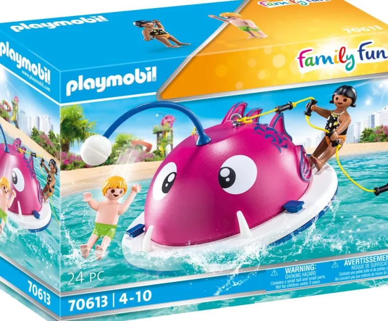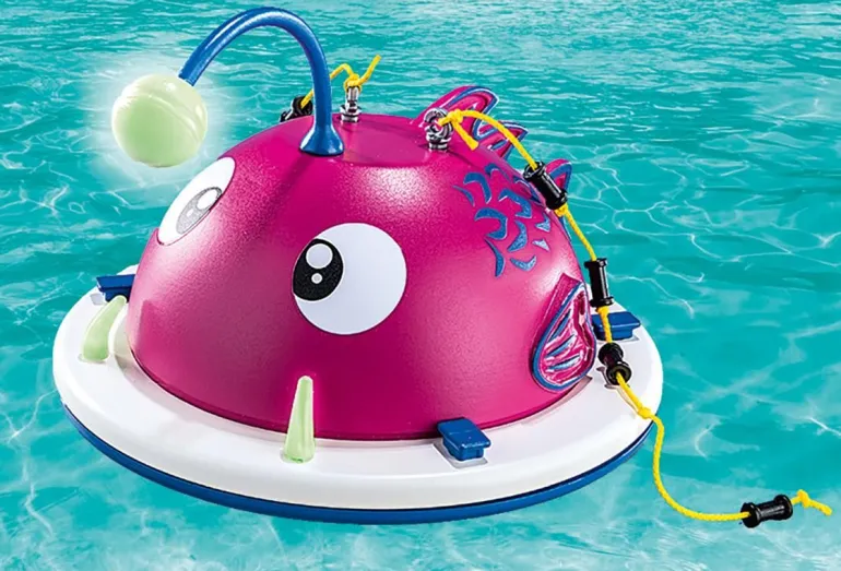 schwimmt im Wasser. Der Laternenkopf und die Zähne des Fischkopfes leuchten im Dunkeln nach.