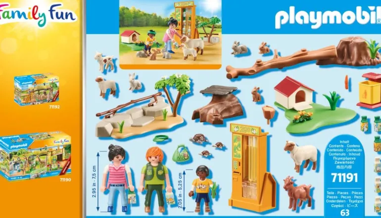 Ein liebevoll gestaltetes Spielset für tierliebe Kinder. Das Set enthält drei PLAYMOBIL-Figuren, eine Ziege mit Zicklein, ein Schaf mit Lamm, zwei Kaninchen mit Babys, eine Schildkröte, einen Futterautomaten, acht Futtertüten und viele weitere tolle Extras. Der Futterautomat ist funktionsfähig und kann immer wieder mit Tierfutter aufgefüllt werden. Das Spielset eignet sich ideal zur Erweiterung des großen Erlebnis-Zoos 71190.