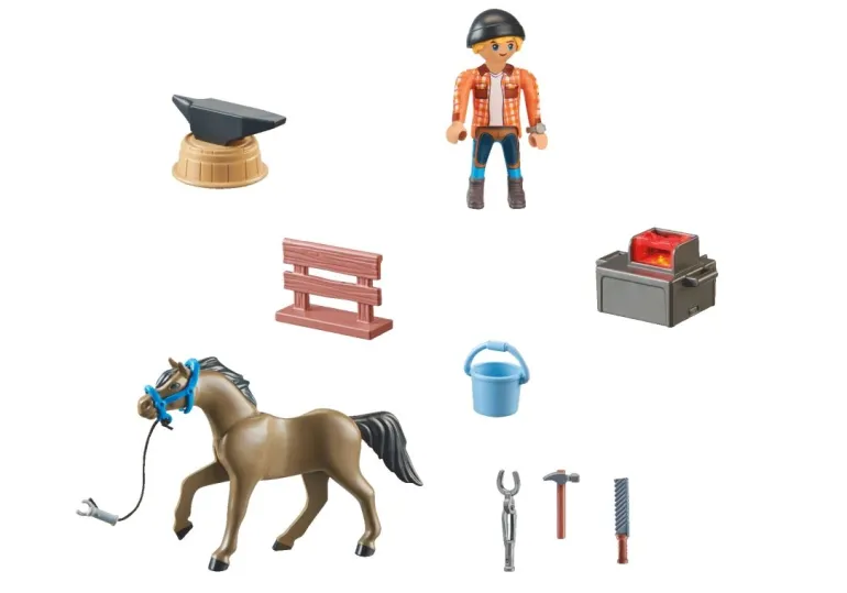 • Detailreiches Pferdespielzeugset mit PLAYMOBIL-Hufschmied Ben, Pferd Achilles, Amboss, Zange, Hammer und Esse und vielen weiteren Extras zum Beschlagen der Pferde