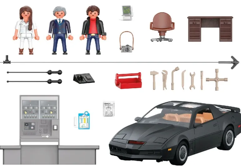 Knight Rider – Ein Mann und sein Auto kämpfen gegen das Unrecht.“ Ein totgeglaubter Polizist mit einer neuen Identität, getrieben vom Wunsch nach Gerechtigkeit, macht sich mit der Hilfe von K.I.T.T., einem futuristischen Auto mit künstlicher Intelligenz, Hightech Ausstattung und Waffen auf, das Verbrechen zu bekämpfen. Jetzt hält K.I.T.T., das legendäre Wunderauto aus der 80er-Jahre Hit-Serie Knight Rider Einzug in die PLAYMOBIL-Autoflotte. Genau wie sein großer Bruder ist das K.I.T.T. Fahrzeugmodell von PLAYMOBIL mit einer ganzen Reihe authentischer Funktionen ausgestattet, wie einem Drucker unter dem Armaturenbrett zum Ausdrucken von Fahndungsfotos, einem drehbaren Nummernschild, einem Seil mit Enterhaken, ausfahrbaren Scheinwerfern und einem abnehmbaren Dach. K.I.T.T. verfügt über elektronische Geräusche und Lichter, die über ein Touch-Feature auf der Motorhaube gesteuert werden. Das Fahrzeug zitiert Sätze aus der Serie mit der kultigen Originalstimme von K.I.T.T.. Bestimmte Zitate sind mit der Ein/Aus-Funktion verknüpft, die anderen werden nach dem Zufallsprinzip abgespielt. Gleichzeitig leuchtet die ikonografische Lichterkette am Kühlergrill des Fahrzeugs auf und das Licht auf dem Armaturenbrett flackert. Neben Titelheld Michael Knight enthält das Spielset auch ausgefeilte Accessoires wie Bonnie Barstows Computerlabor und Devon Miles‘ Büromöbel. Jetzt heißt es einsteigen und losfahren zur nächsten Mission!
