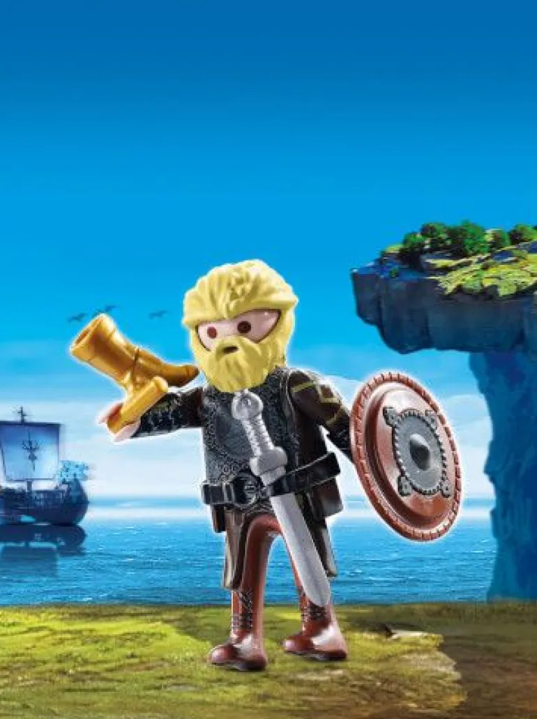 Der mutige Wikinger ist auf dem Wachposten. Er hat sich ganz oben auf der Klippe postiert und hält Ausschau nach feindlichen Schiffen. Aufmerksam lässt er seinen Blick über das Meer schweifen. Zur Stärkung hat er ein Trinkhorn dabei. Das Spielset enthält eine Wikingerfigur mit Trinkhorn, Schwert und Schild. Ergänze deine Spielwelten mit den tollen PLAYMO-Friends Figuren und erlebe jede Menge aufregende Abenteuer.