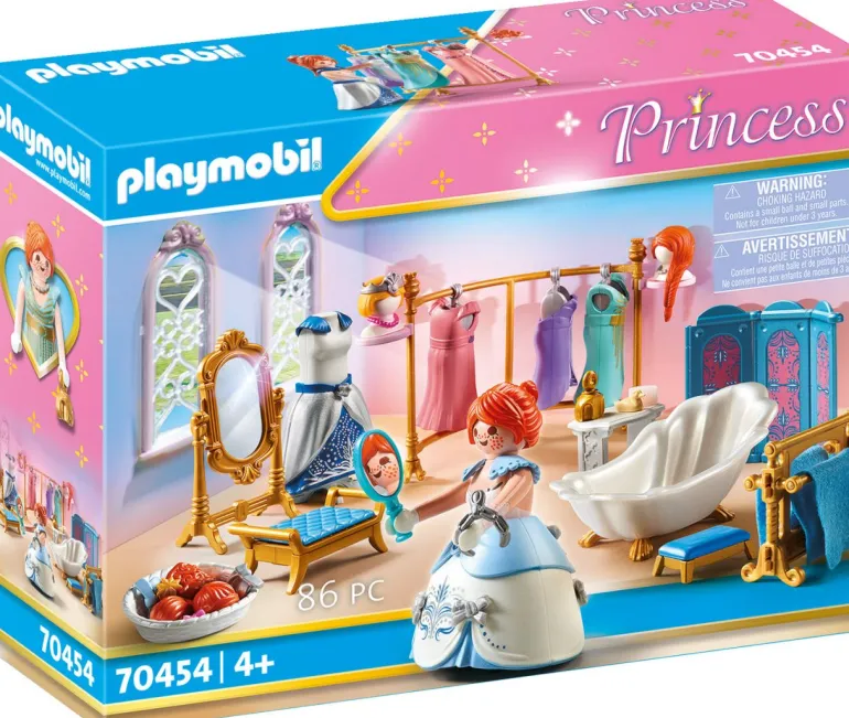 Das Spielset enthält eine PLAYMOBIL-Figur, Prinzessin Sally aus Australien, eine Muschelbadewanne, einen Paravent, eine Kleiderstange mit Kleiderbügeln und Kleidern, einen Schminkplatz mit Spiegel und Sitzbank sowie vielen weiteren Stylingaccessoires.