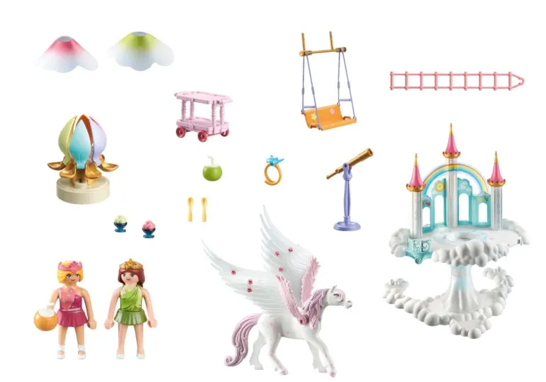 • Zauberhaftes Prinzessinnen-Spielzeug mit zwei PLAYMOBIL-Figuren, einem Pegasus mit beweglichen Flügeln, einem Regenbogenschloss mit Himmelsschaukel, leuchtender Regenbogenblüte, Stickerbogen und vielen weiteren magischen Extras für fantasievolle Rollenspiele im Kinderzimmer
