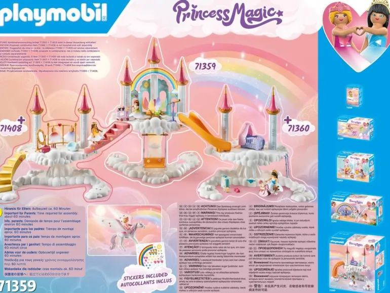 „Das himmlische Regenbogenschloss von PLAYMOBIL entführt Kinder ab vier Jahren in ein romantisches, watteweißes Reich voller bezaubernder Charaktere, magischer Fabelwesen und märchenhafter Bauwerke. Behütet vom Regenbogen und dem Licht der Regenbogenblüte sorgen die Prinzessinnen für das Wohlbefinden aller Geschöpfe. In Kombination mit den Spielsets himmlische Babywolke (71360) und himmlische Ankleidewolke (71408) entsteht eine große farbenfrohe Regenbogenszene.