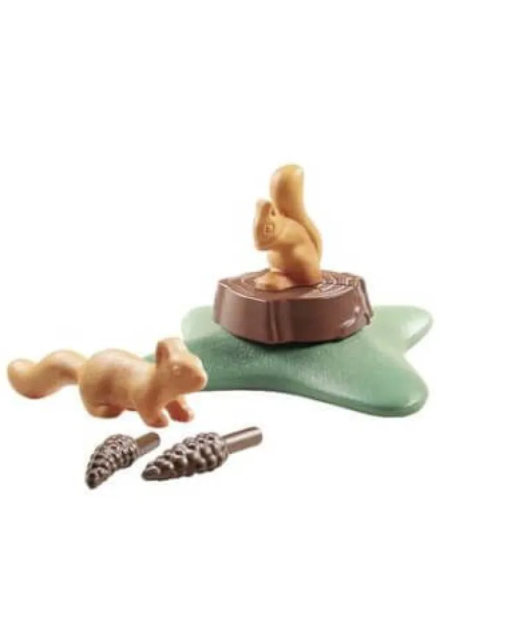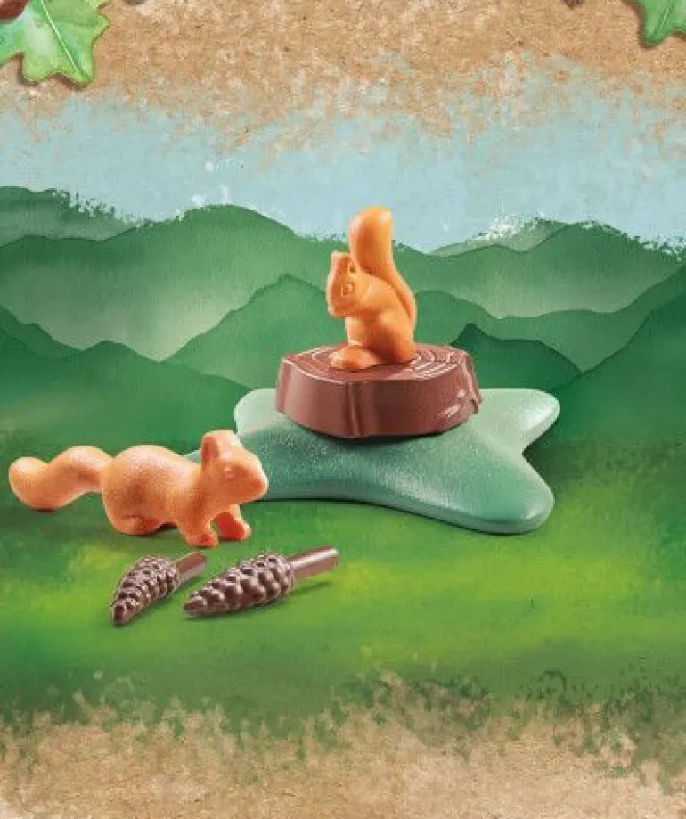 Das Spielset enthält zwei PLAYMOBIL-Eichhörnchen, einen Baumstamm, zwei Tannenzapfen und eine Tierwissenskarte.