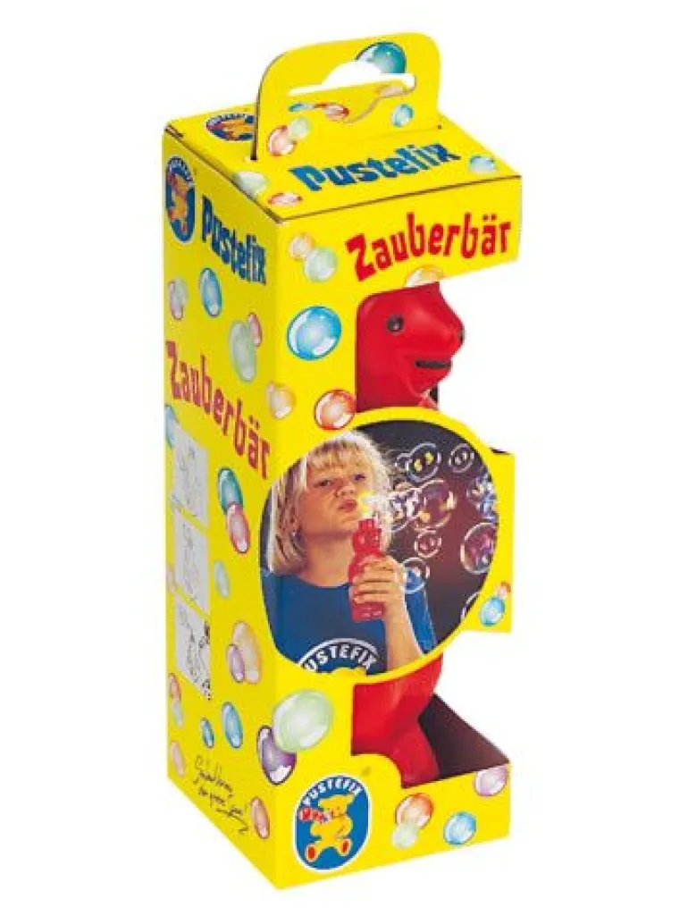 Pustefix Zauberbär. Heimlich den Bauch des Bären drücken und Hokus Pokus erscheint der Blasenring. Fix gepustet und Abra kadabra – alle sind verzaubert von den magischen Pustefix Seifenblasen.