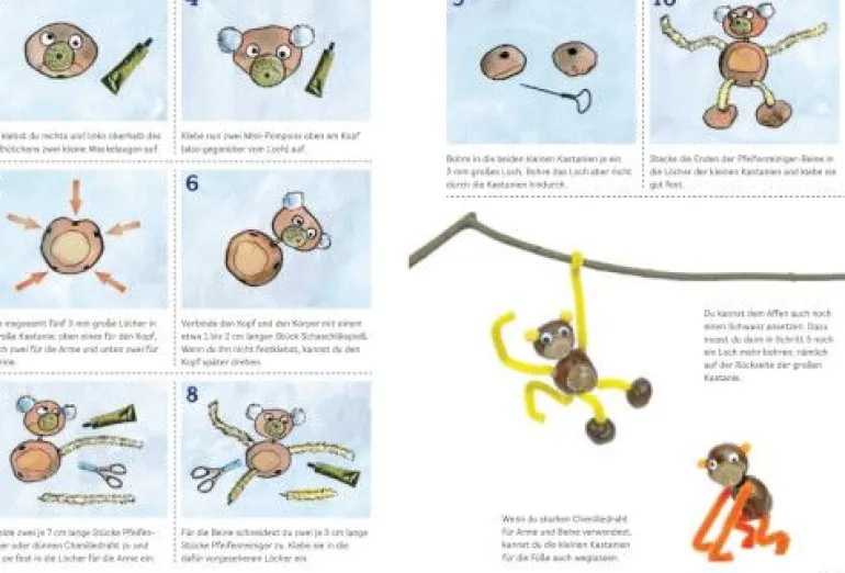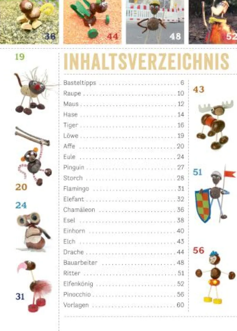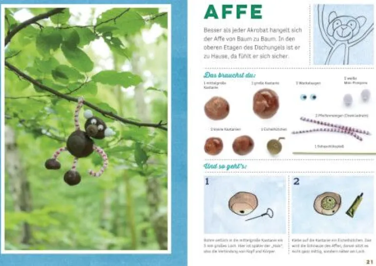 Nichts macht im Herbst mehr Spaß, als mit der ganzen Familie draußen Kastanien zu sammeln, um daraus die tollsten Figuren zu kreieren – vom stolzen Löwen bis zum tapferen Ritter. Dieses Buch zeigt in genau illustrierten Schritt-für-Schritt-Anleitungen, wie Sie mit Ihren Kindern Tiere und Männchen aus Kastanien und anderen Materialien leicht nachbasteln können. Neben einer Einführung zu dem benötigten Zubehör gibt es jeweils ein Foto, auf dem jede der 20 Figuren – atmosphärisch in der Natur inszeniert – zu sehen ist. 64 Seiten. Ein bunter Bastelspaß für kleine Künstler ab 5 Jahren.
