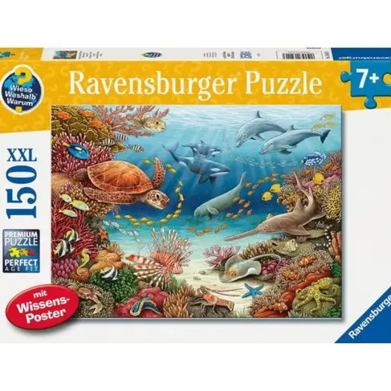 Die beliebte Buchreihe Wieso? Weshalb? Warum? gibt es auch als Puzzle! Stück für Stück entsteht aus 150 Puzzleteilen ein farbenfrohes Korallenriff. Die Kinder entdecken beim Puzzeln viele Tiere die dort leben. Ein liebevoll gestaltetes Wissensposter liefert interessante Informationen, beispielsweise welche Tiere gefährlich oder giftig sind.Altersgerechter Puzzlespaß im XXL-Format: Ein Tauchgang in bunte Unterwasserwelten, eine Zeitreise ins Land der Dinosaurier, eine Entdeckungstour in die Heimat von Tiger, Elefant & Co, oder ein zauberhaftes Abenteuer im Einhornland – Puzzleteil für Puzzleteil können Kinder in fantastische Welten eintauchen und staunen! Unsere Puzzles werden in exzellenter Verarbeitungsqualität mit Material aus nachhaltiger Forstwirtschaft gefertigt. Pädagogisch wertvoll und mit ganz viel Lernspaß.Teile suchen, anfügen und sich über das immer größer werdende Bild freuen – Puzzeln ist, wenn sich ein Erfolg an den anderen reiht. Deshalb lieben Kinder es, die Puzzleteile immer wieder zu ihren Lieblingsmotiven zusammen zu setzen. Doch Puzzles bieten mehr als Spaß: Mit der richtigen Schwierigkeit gewählt, lassen sie Kinder jeden Alters an den Herausforderungen wachsen, erhöhen ihre Geduld und stärken ihr Selbstvertrauen. In der großen Auswahl von Ravensburger Kinderpuzzles mit den beliebtesten Motiven, von 2 Teilen bis 300 Teilen, ist garantiert für jedes Kind das Richtige dabei. Die Auswahl der Motive und die hohe Qualität unserer Kinderpuzzles liegen uns sehr am Herzen. Seit mehr als 100 Jahren entwickeln wir Puzzles, wie Kinder sie lieben: altersgerecht in Motiv, Teilezahl und -größe.