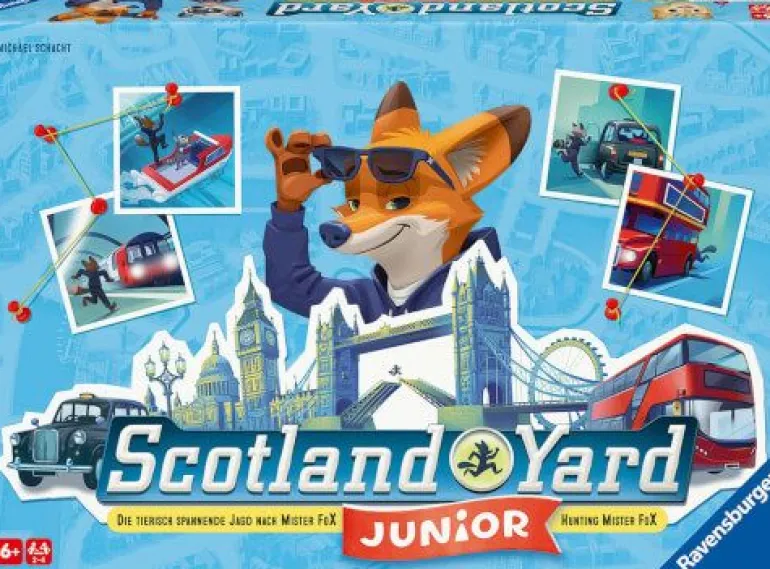 Gemeinsam jagen die tierisch cleveren Detektive den geheimnisvollen Mister FoX kreuz und quer durch London. Mister FoX bewegt sich für alle sichtbar mit Taxi, Bus oder Underground. Doch wohin flieht er als Nächstes? Vorsicht: Er trickst gerne die Detektive aus. Gefangen ist er, wenn sich ein Detektiv gleichzeitig auf dieselbe Station bewegt! Ein tierisch mitreißender Einstieg zu Scotland Yard: einfache Regeln, kurze Spielrunden und spannend bis zum Schluss!Scotland Yard Junior ist eine veränderte und vereinfachte Form des Spiele-Klassikers Scotland Yard für Kinder ab 6 Jahren. Hier spielt es in einer tierischen Themenwelt in London. Mister X wird zum Fuchs Mister FoX , die Detektive sind ein cleveres Team aus Katze und Hund. Bei vier Spielern ist die Waschbärdame RoXi als Komplizin von Mister FoX mit von der Partie. Zuerst zieht der Ganove, indem er das Ticket, dass zu seiner nächsten Station führt, geheim unter dem Tisch in die Hand nimmt. Auch stehenbleiben ist erlaubt. Danach sind beide Detektive an der Reihe. Sie versuchen zu durchschauen, wohin die Flucht von Mister FoX geführt hat. Beim Auflösen wird es jedes Mal spannend: Wurde er geschnappt, erhalten die Detektive einen X-Chip, bei erfolgreicher Flucht Mister FoX. Wer seine Tafel zuerst mit X-Chips füllen konnte, gewinnt die Verfolgungsjagd!