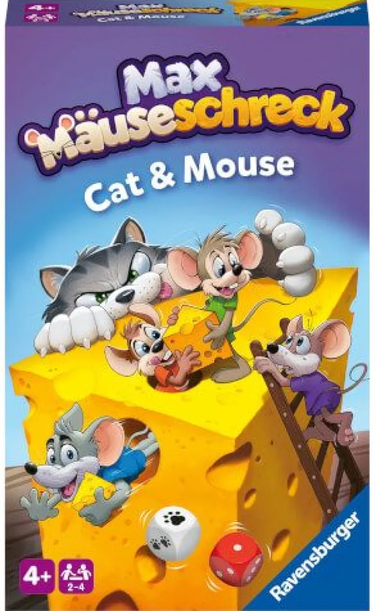 Hmm, so ein leckerer Käse! Die kleinen, frechen Mäuse flitzen herum und können gar nicht genug davon bekommen! Je nachdem, auf welches Feld sie ziehen, dürfen sie ein oder sogar zwei Stücke aus dem Vorrat sammeln. Doch Vorsicht: Kater Max schleicht umher. Die Maus, die auf ihn trifft, verliert vor Schreck ein Stückchen Käse. Oder manchmal spielt Max mit ihnen und dann können die frechen Nager eine Weile nicht mehr weiterziehen. Welche von ihnen ist die Mutigste und kann zuerst 5 Käsestücke ergattern? Die kompakte Version des beliebten Aktionsspiel ist ideal für Kinder ab 4 Jahren und passt in jedes Reisegepäck.Jeder Spieler sucht sich seine Lieblingsmaus aus. Der Punktewürfel bestimmt, wie weit sie ziehen darf. Der Pfotenwürfel zeigt dagegen die Laufweite von Kater Max an. Bei jedem Zug werden beiden Würfel geworfen und zuerst die Maus und danach der Kater bewegt. Je nachdem, auf welchem Feld eine Maus landet, darf sie ein oder zwei Käsestücke sammeln. Immer wieder trifft eine kleine Maus auf ein Sonderfeld, zum Beispiel den Käsewirbel. Jetzt wird der Käse in der Mitte des Plans gedreht: Auf welchem Feld wird die Maus nun landen? Als Ruhepause gibt es zudem das Mausloch. Hier sind die Nager vor Max immer sicher, der für sein Leben gern die Kleinen erschreckt. Dabei will er eigentlich nur mit ihnen spielen! Welche Maus sichert sich als Erste fünf Käsestücke und gewinnt damit die lustige Käse-Jagd?