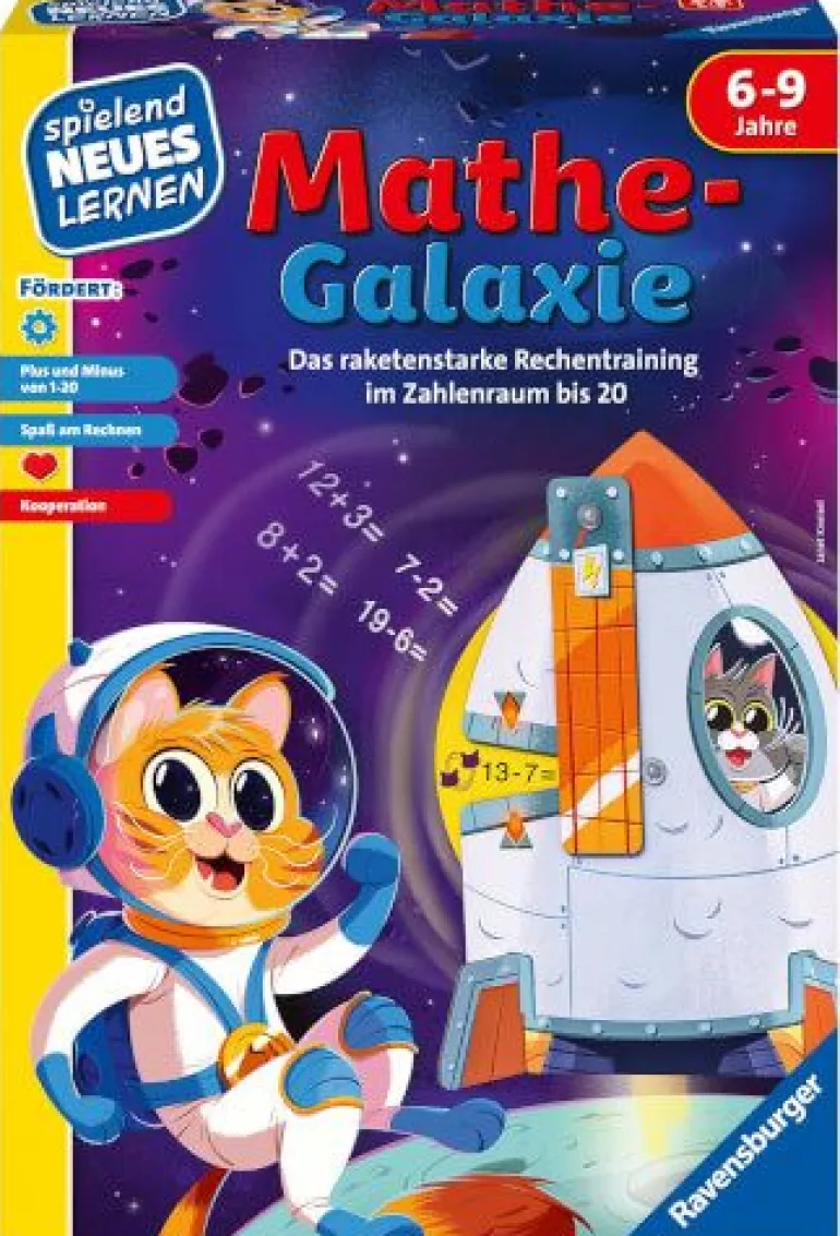 Die Mathe-Galaxie bringt Spannung und Spaß ins Rechen-Training: An der Rakete drehen, Rechnen, Lösung kontrollieren und zuerst sein liebstes Katzen im Weltall Puzzle lösen! Die Mathe-Galaxie kombiniert Spielspaß und Rechnen und ist kooperativ und im Wettbewerb spielbar. Mit der attraktiven Ausstattung und den zahlreichen Spielmöglichkeiten ist es ein ideales Geschenk zur Einschulung oder zur Unterstützung beim Lernen.Dieses Spiel bietet Kindern ein abwechslungsreiches Rechentraining, bei dem sie ihre mathematischen Fähigkeiten erweitern und Konzentration üben. In das attraktive 3-D-Spielgerät, eine Rakete mit beweglichem Sonnensegel, wird eine von sieben Aufgaben-Drehscheiben eingeklippst. Diese enthalten Aufgaben in verschiedenen Schwierigkeitsleveln. Wird eine Aufgabe richtig gelöst, deckt der Spieler ein Puzzlekärtchen auf und vervollständigt eines von 5 Weltraum-Katzen-Motiven. Ist das Motiv komplett, ist das Spiel gewonnen. Mathe-Galaxie ist dabei kooperativ oder im Wettbewerb spielbar. Punktgenau auf den Wissenstand der Kinder abgestimmt, können unterschiedliche Aufgaben gewählt werden. Zum Einstieg eignen sich Aufgaben, in dem Mengen und Zahlen zugeordnet oder Würfelpunkte zusammengezählt werden müssen. Zudem gibt es Aufgaben, bei denen Plus oder Minus bis 10 oder bis 20 geübt werden.