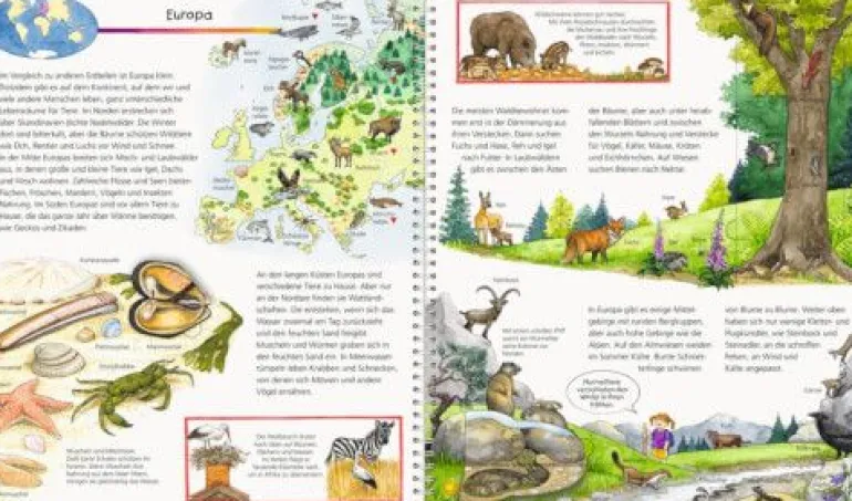 Ob in der Wüste, im Regenwald, im Meer oder im ewigen Eis # überall leben Tiere. Mit diesem Buch reisen Kinder um die Welt und lernen über 500 Tierarten und ihre Lebensräume kennen. Jede Doppelseite widmet sich einem anderen Kontinent. Auch die Polargebiete und die Ozeane werden vorgestellt. Landkarten veranschaulichen, wo die Tiere wohnen. Naturgetreue Illustrationen und Klappen vermitteln die Besonderheiten und Überlebenstricks der Tiere. Vom Ara bis zum Zwergpinguin, vom Hammerhai bis zum Zebra # dieses Buch ist prall gefüllt mit bekannten und ungewöhnlichen Tieren.Warum hat der Eisbär eine schwarze Haut? Wo leben die größten Tiere der Erde? Und was ist eine Nahrungskette? Dieses Buch stellt Tierarten aus aller Welt vor. Auf den 24 Seiten dieses Sonderbands reisen Kinder durch alle Kontinente, die Polargebiete und werfen einen Blick unter die Meeresoberfläche. Landkarten veranschaulichen, wo welche Tiere zu Hause sind. Eindrucksvolle Szenen und Klappen zeigen die Besonderheiten der Tiere und erklären, wie sie sich an ihren jeweiligen Lebensraum angepasst haben. Ob Krebstiere, Insekten, Amphibien, Reptilien, Fische, Weichtiere, Säugetiere oder Vögel # alle Tiergruppen sind vertreten. Symbole zeigen an, welche Tierarten bedroht sind. So schafft dieses Buch auch ein Bewusstsein dafür, wie wichtig Artenschutz und Artenvielfalt sind. Zum Abschluss gibt es Anregungen, wo man Tiere selbst beobachten kann. Ein Lieblingsbuch für Tierfreunde von 4-7 Jahren.