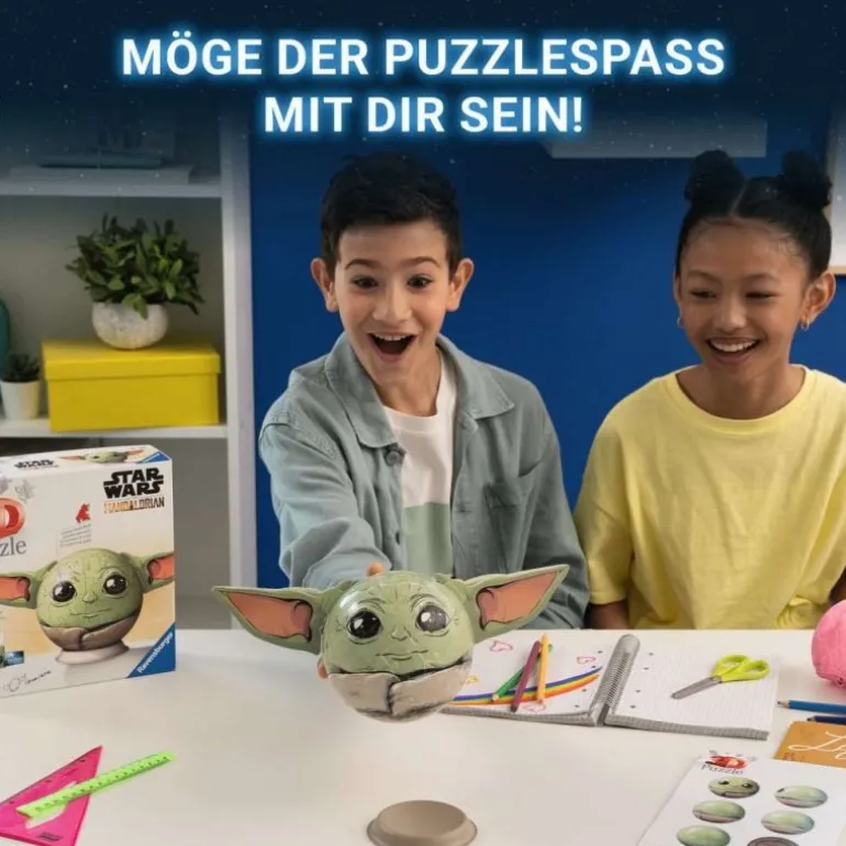 Grogu nahm die Welt im Sturm ein: Und jetzt kommt der Baby Yoda auch nach Hause! Mit diesem 3D Puzzle-Ball mit den dekorativen Ohren aus stabiler Pappe hält das beliebte „Child“ Einzug in jedes Zimmer. Aus gewölbten Kunststoff-Puzzleteilen, die dank EasyClick Technology perfekt zusammen passen, entsteht Stück für Stück dieser stabile 3D Puzzle-Ball, ganz ohne Kleben. Die Nummerierung der Teile auf der Rückseite erleichtert das Vorsortieren und ermöglicht einfaches Puzzeln nach Zahlen.