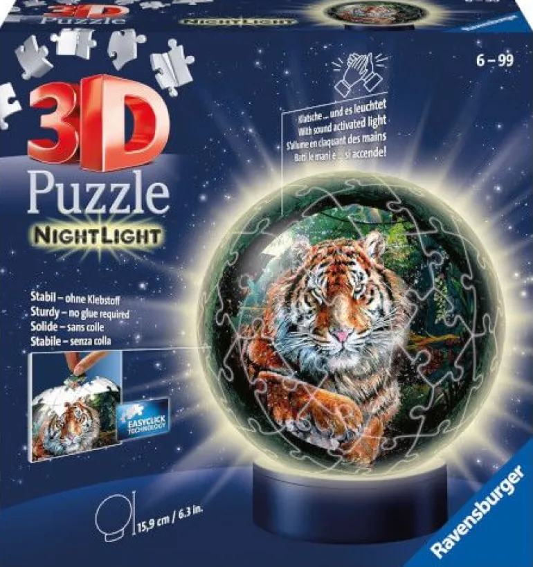 Dieser 3D Puzzle-Ball im coolen Raubkatzen-Design wird mit einem Händeklatschen zum außergewöhnlichen Nachtlicht, wenn der Leuchtsockel den Ball von innen erstrahlen lässt. Aus gewölbten Kunststoff-Puzzleteilen, die dank Easyclick Technology perfekt zusammen passen, entsteht Stück für Stück dieser stabile 3D Puzzle-Ball, ganz ohne Kleben.