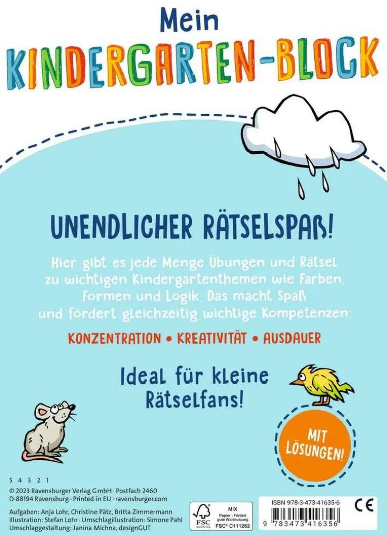 Rätselspaß für Kindergartenkinder ab 4 JahrenIn diesem Block finden sich abwechslungsreiche Logik- und Konzentrationsübungen. Kindgerecht illustrierte Aufgaben fördern spielerisch logisches Denken, Aufmerksamkeit und Ausdauer. Bewährte Rätselformen wie Suchbilder, Labyrinthe und Zählaufgaben machen den Kindern Spaß und motivieren immer wieder neu.