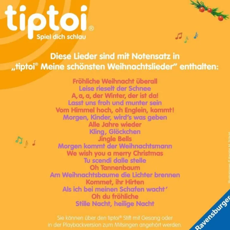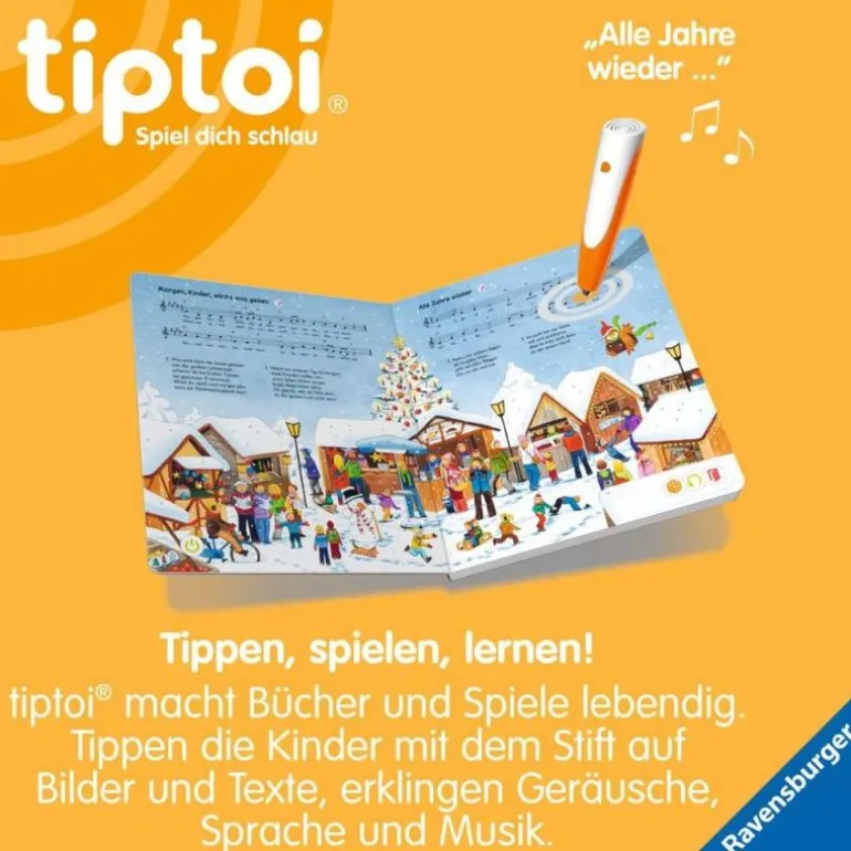Fröhliche Weihnacht überall! Mit vielen beliebten Weihnachtsliedern erleben Kinder eine wunderbare, musikalische Adventszeit. Die Mäuse öffnen aufgeregt die Türchen am Adventskalender, Menschen und Tiere haben Spaß im Schnee, der Nikolaus verteilt Geschenke und die Bärchen backen Plätzchen und malen Wunschzettel. Wie feiert man in anderen Ländern Weihnachten? Wie wird die Weihnachtsgeschichte in der Bibel erzählt? Wie sind Traditionen wie der Adventskranz entstanden? Mit den tiptoi Liederbüchern macht Singen besonders großen Spaß! Die abgedruckten Lieder können mit Gesang oder in der Instrumentalversion angehört werden. Die Notensätze und Gitarrenakkorde laden zum Musizieren ein. Neben den abgedruckten Liedern sind zahlreiche weitere auf den Bildern versteckt. Liebevolle Illustrationen werden durch kindgerechte Texte zum Leben erweckt. Lustige Reime und spannende Spiele lassen die Kinder in die Themenwelten eintauchen. Musik ist überall! tiptoi-Stift nicht enthalten. Muss separat erworben werden.