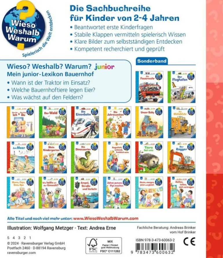 Die beliebte Sachbuchreihe Wieso? Weshalb? Warum? junior beantwortet die Fragen der Kinder auf Augenhöhe. Sie beleuchtet unterschiedlichste Themen aus ihrer Alltags- und Interessenswelt altersgerecht und mit viel Liebe zum Detail.Die Reihe ist speziell auf kleine Hände und die Bedürfnisse der Kleinsten angepasst. Klare und liebevolle Bilder, kurze Sachtexte sowie handliche Klappen, die Bewegungen veranschaulichen und überraschende und lustige Einblicke gewähren, ermöglichen Kindern, sich ihre Themen selbst zu erschließen. Der Spaß am eigenhändigen Entdecken, die liebevolle Umsetzung und die hochwertige Ausstattung garantieren langanhaltende Freude an jedem Buch.