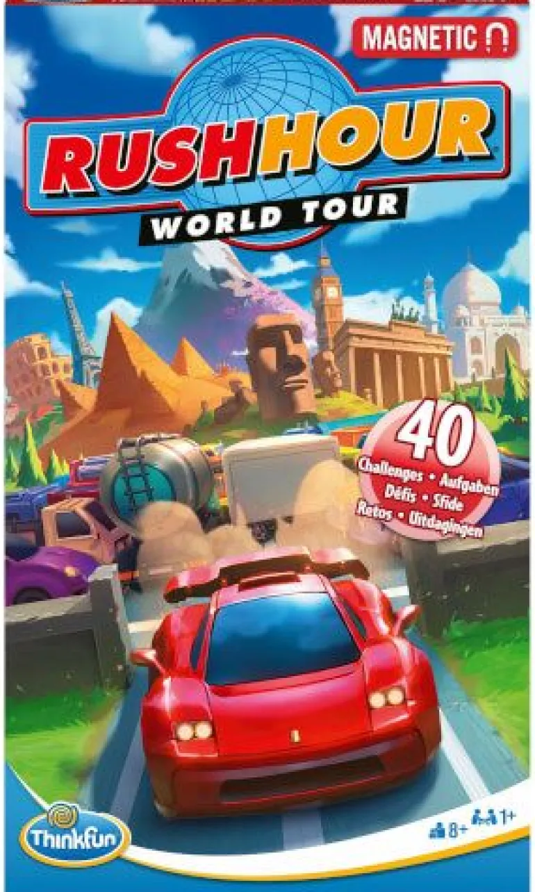 Mal wieder Stau auf deiner Reise? Mit dem Rush Hour World Tour Reise-Knobelspiel kommt keine Langeweile auf. Entkomme dem Stau und lerne dabei 10 verschiedene internationale Sehenswürdigkeiten kennen.Bei Rush Hour manövriert der Spieler das rote Auto geschickt durch einen Stau zur Ausfahrt, indem er andere Fahrzeuge clever aus dem Weg schiebt. Das Rush Hour World Tour magnetische Reise-Knobelspiel macht jede Reise zu einem kurzweiligen Abenteuer! Der Logikspiel-Klassiker Rush Hour als praktisches Reise-Knobelspiel, ideal für Unterwegs mit magnetischen Spielelementen