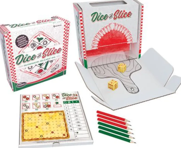 Wer kombiniert am cleversten und kann sich das größte Pizzastück sichern? Würfle und überlege dir, wie du deine Pizza in möglichst große Stücke schneiden kannst um deine Punktzahl zu maximieren. Benutze den beiliegenden Stift, um die Punkte und Linien von den Würfeln auf deine Pizza zu übertragen und deine Pizza in Stücke zu schneiden. Schneide so große Stücke wie möglich und füge den richtigen Belag hinzu! Dice and Slice ist ideal für Spieleabende mit Freunden und Familie.