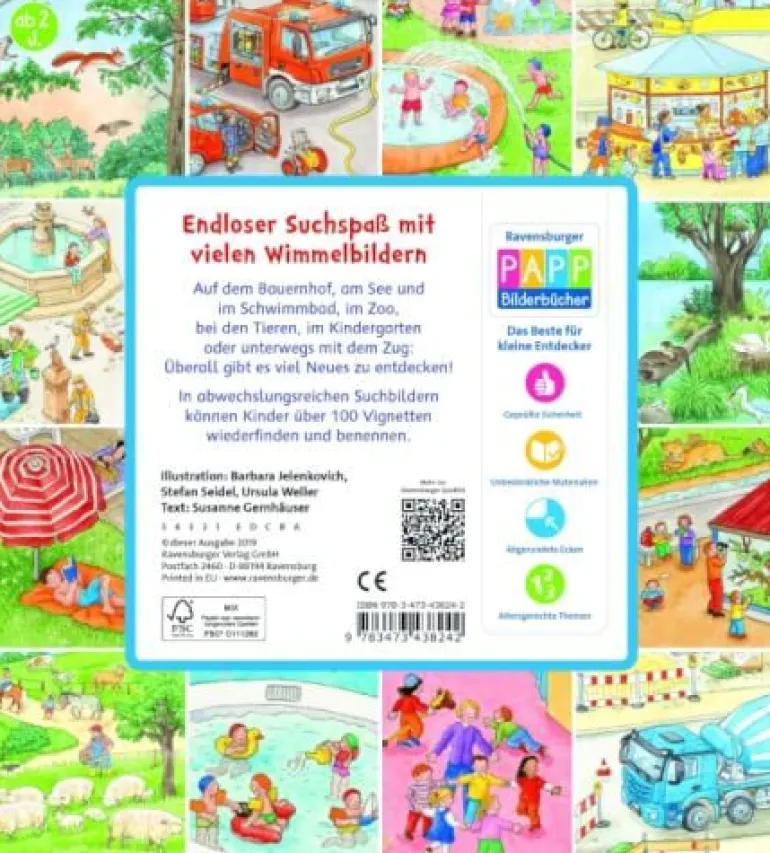 Jede Menge Suchspaß auf 15 Wimmelseiten können Kinder ab 2 Jahren in diesem dicken Buch Sachen suchen. Sie entdecken zum Beispiel den Bauernhof, den Wald, den Spielplatz, das Schwimmbad, den Zoo und viele weitere Orte mehr. Mit über 100 Suchvignetten laden die schönsten Bilder aus der erfolgreichen #Sachen suchen- Reihe zum ersten Benennen und Erzählen ein. Endloser Suchspaß mit vielen Wimmelbildern!Mit über 100 kleinen Suchbildern wird dieser dicke Sonderband für jeden Fan der #Sachen suchen- Reihe zum Lieblingsbuch. 15 der beliebtesten Wimmelszenen nehmen die Kinder mit an folgende Orte: BauernhofWaldWieseSchwimmbadSeeKindergarten StreichelzooBaustelleBahnhofÜberall können Kinder ab 2 Jahren auf der Suchleiste zahlreiche Gegenstände benennen und im Bild wiederfinden. Das regt nebenbei auch zum ersten freien Geschichtenerzählen an und fördert so optimal die Sprachentwicklung.Der Jubiläumsband zeigt die schönsten Szenen der Reihe #Sachen suchen und ist hochwertig ausgestattet mit einer Buchdecke. Dadurch ist er besonders stabil und langlebig.