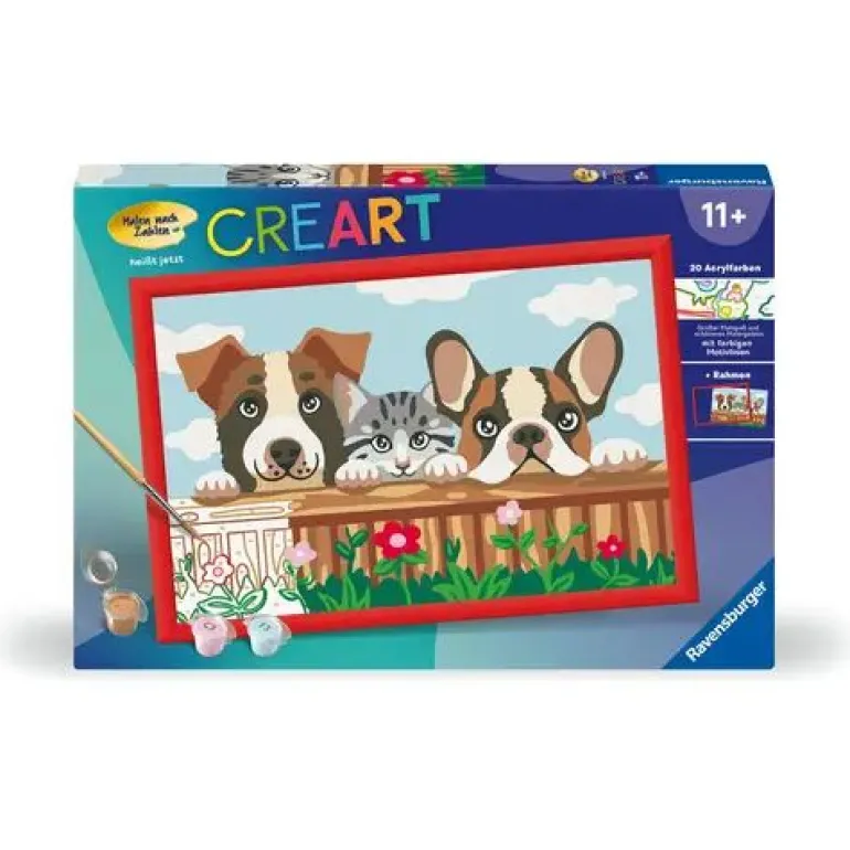 Farbige Motivlinien: Größerer Malspaß & ein schöneres Ergebnis!Dank der farbigen Motivlinien, können die Kinder das ganze Motiv Hunde und Katze und die Farben schneller erkennen. Der Pinsel hat eine gute Führung und so entsteht ein perfektes Bild.Die schönen Motive zum Ausmalen sind eine tolle Geschenkidee für Kinder ab 11 Jahren und eine schöne Dekoration. In diesem Malset sind bereits 20 fertig gemischte Acrylfarben enthalten. Verpackungsdesign kann abweichen. Mit Malen nach Zahlen von Ravensburger lernen die Kinder Flächen sorgfältig auszumalen, ihr Maltalent zu verbessern sowie feinmotorische Fähigkeiten zu entwickeln. Am Ende stehen Freude, Stolz und ein Erfolgserlebnis, das die Lust am Weitermalen weckt.Die Motive sind altersgerecht in drei Schwierigkeitsstufen umgesetzt: von einfachen Bildern mit wenigen, großen Malflächen bis hin zu Bildern mit vielen, kleinen Malflächen für Fortgeschrittene.Jedes Malset enthält alles, was Künstler zum Malen brauchen und es ist kein Mischen der Farben notwendig.Das Ravensburger Malen nach Zahlen Programm bietet eine große Motivauswahl für Kinder und Erwachsene.