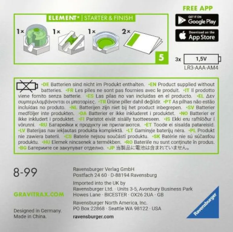 Die GraviTrax POWER Elemente Starter & Finish umfassen mit beiden elektronischen Komponenten einen Bestandteil für das Ravensburger Kugelbahnsystem.Eine neue Kugel soll starten, sobald die vorherige Kugel die Bahn durchlaufen und das Ziel erreicht hat? Mit dem GraviTrax POWER Elementen Starter & Finish ist das kein Problem. Der Starter und die Ziel-Arena fassen jeweils bis zu 7 Kugeln. Die beiden POWER Elemente der Kugelbahn sind über Funk miteinander verbunden. Sobald eine Kugel das zweiteilige Ziel durchläuft, wird eine neue Kugel auf den Track geschickt! Für noch mehr Action und vielfach längere Laufzeiten.GraviTrax ist ein flexibel erweiterbares, interaktives Kugelbahnsystem für Kinder ab 8 Jahren: