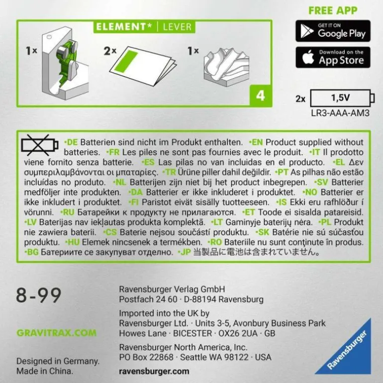 Mit dem elektronischen GraviTrax POWER Element Lever können Kugeln nacheinander wiederholt auf höhere Ebenen der GraviTrax Kugelbahn gehoben werden.Immer wieder Höhe zurückgewinnen ohne manuelles Eingreifen! Das Gravitrax POWER Element Lever hebt Kugeln bis zu 4 Höhensteine nach oben und wird nach jeder Kugel automatisch in seine Ausgangsposition zurückgestellt.