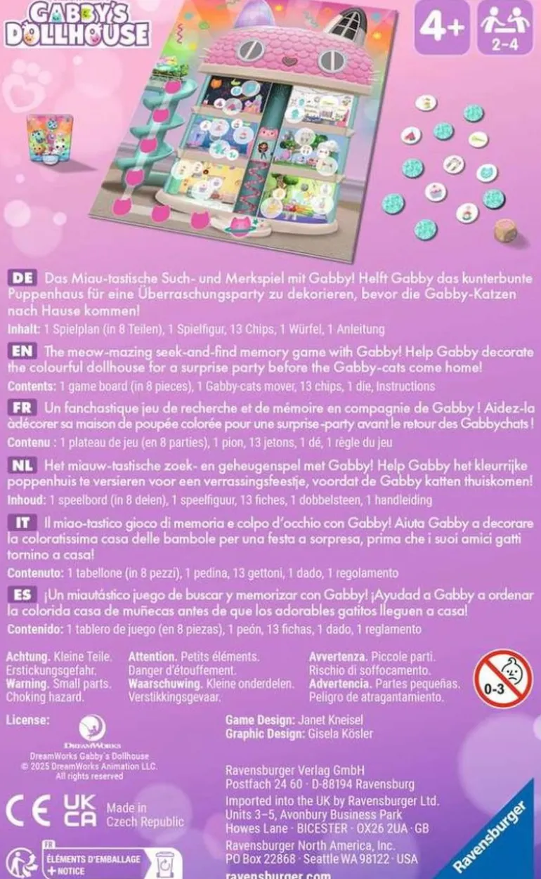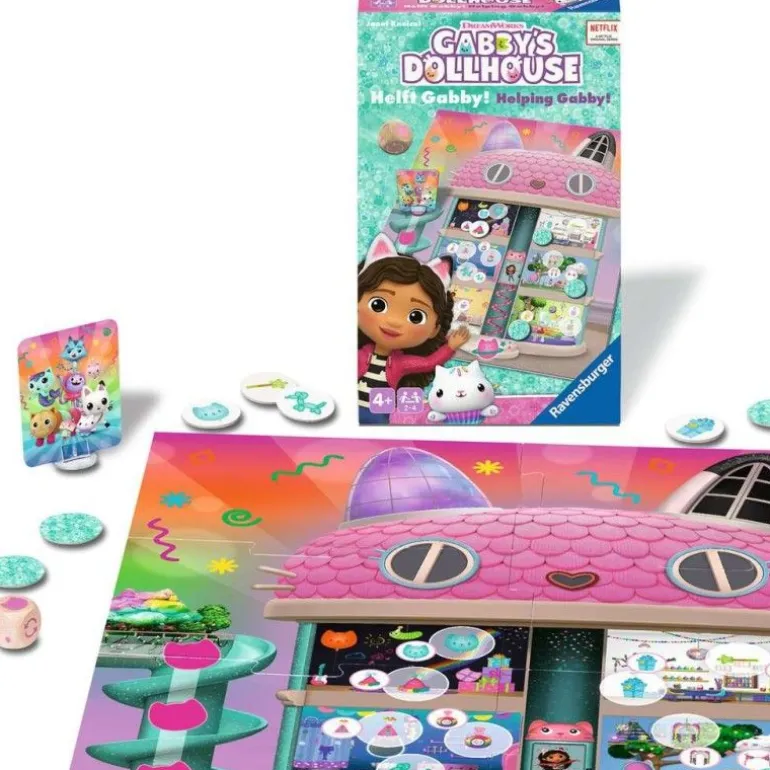 Im kunterbunten Chaos von Gabby’s Puppenhaus steht ein aufregendes Abenteuer bevor. Gabby plant, ihre Katzenfreunde mit einem aufgeräumten Zuhause zu überraschen, bevor sie zurück kommen. In diesem spannenden Such- und Merkspiel für 2-4 Fans der beliebten Vorschulserie Gabby’s Dollhouse ist es Zeit, die Ärmel hochzukrempeln! Können die Spieler gemeinsam Gabby unterstützen und alle Gegenstände an ihren ursprünglichen Platz zurückbringen?Helft Gabby ist ein zauberhaftes Brettspiel in der magischen Welt von Gabby’s Dollhouse, indem die Spieler kooperativ versuchen das kunterbunte Durcheinander im Puppenhaus zu beseitigen! Mit einer kurzen Spieldauer von nur 10 Minuten bietet es schnellen und einfachen Spaß für zwischendurch. Der liebevoll gestaltete Inhalt und die einfachen Regeln sorgen für kinderleichtes Spielvergnügen und begeistert Kinder ab 4 Jahren. Dank des kompakten Packungsformats ist das Kinderspiel ideal für unterwegs – perfekt für Reisen und Besuche bei Freunden und Familie. Das Spiel fördert spielerisch die Konzentration, Merkfähigkeit und Fantasie der Kinder.