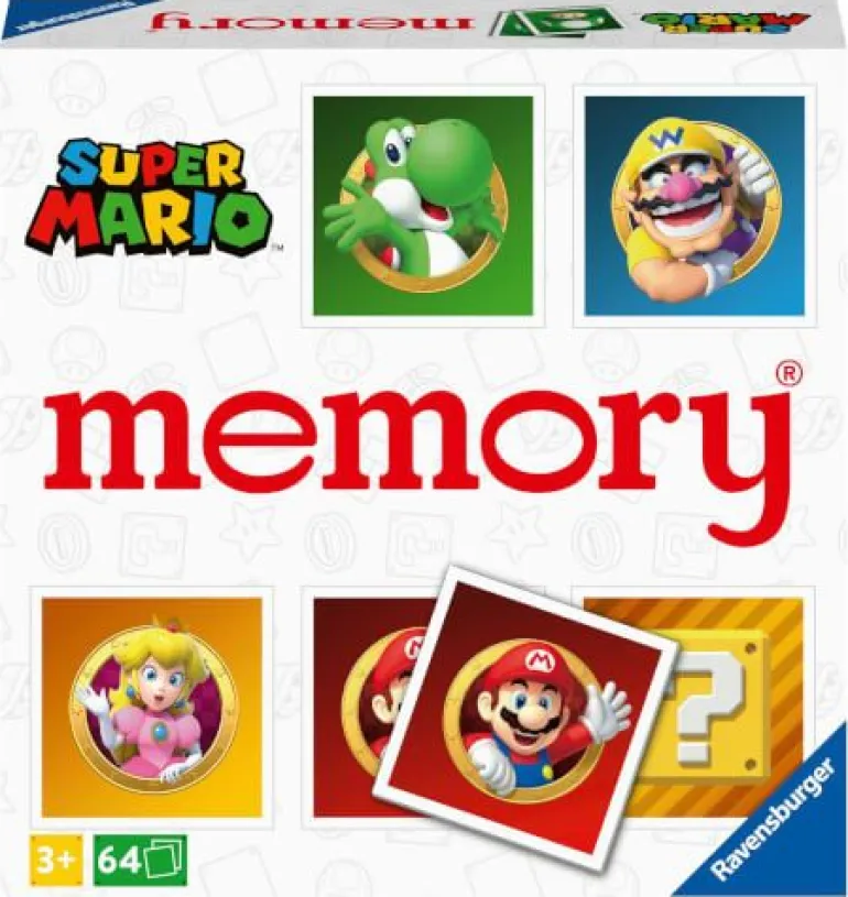 Die beliebten Figuren aus den Super Mario Spielen sind als Bildkarten im Super Mario memory® enthalten: Luigi, Yoshi, Donkey Kong, Prinzessin Peach, Toad, Bowser und natürlich Mario! Ziel ist es, die meisten Kartenpaare zu gewinnen. Dazu müssen sich die Spieler gut merken, wo die beiden gleichen Karten liegen. Wer am Ende die meisten Paare sammelt, gewinnt das Spiel. memory® garantiert Spielspaß für die ganze Familie und fördert spielerisch Gedächtnis, Konzentration und Merkfähigkeit.„It’s-a-me, Mario!
