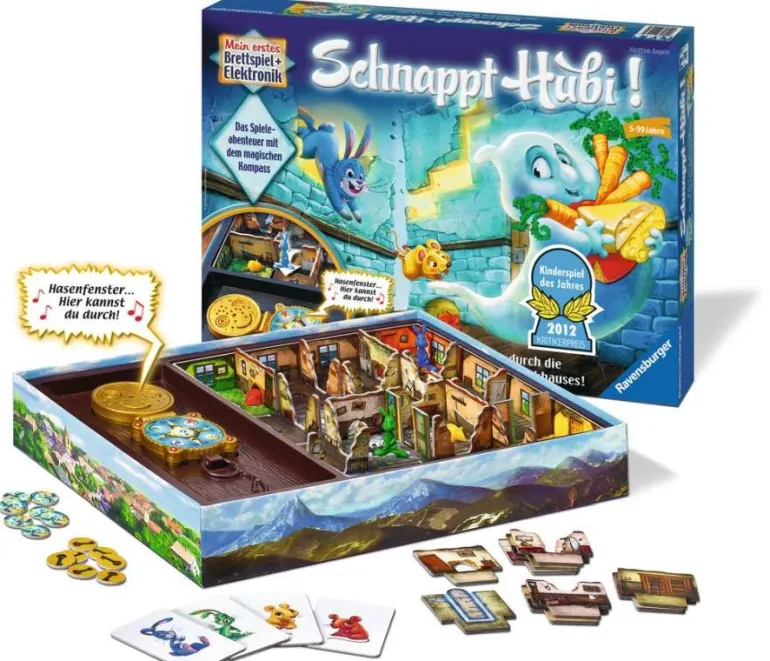 1 magischer Kompass mit elektronischer Einheit, 1 3D-Spielplan, 4 Spielfiguren, 4 Spielertafeln, 27 unterschiedliche Spukhaus-Wände, 14 Chips