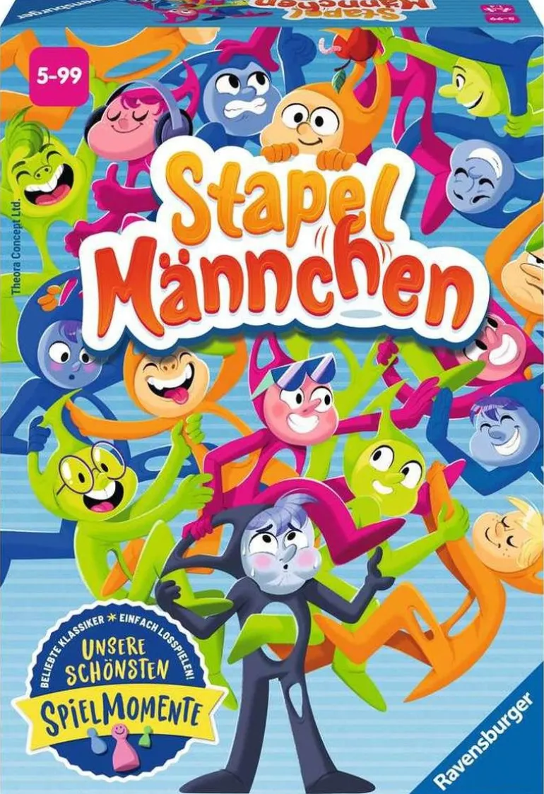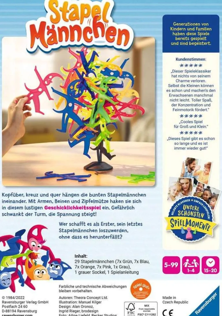 Seit Generationen begeistert dieses Geschicklichkeitsspiel Kinder und Familien. In dieser neu gestalteten Ausgabe gibt es die beliebten Stapelmännchen in 4 tollen neuen Farben. Die Spieler bauen einen Turm – alles ist erlaubt! Kreuz und quer stecken, hängen oder klemmen die Stapelmännchen aneinander. Gefährlich schwankt der Turm, die Spannung steigt! Wer schafft es als Erster, sein letztes Stapelmännchen loszuwerden, ohne das eins herunterfällt? Dabei ist viel Geschicklichkeit gefragt! Jeder Spieler erhält die 7 Stapelmännchen einer Farbe. Der Reihe nach befestigen die Spieler nun eins ihrer Männchen an dem wachsenden Stapelmännchen-Turm. Gerade, schief oder kopfüber – alles ist erlaubt, Hauptsache das Stapelmännchen hängt in der Luft! Aber Vorsicht: versucht ein Spieler gerade, sein Stapelmännchen am Turm zu befestigen, und es fallen Stapelmännchen herunter, muss der Spieler all diese heruntergefallenen Männchen zu seinem Vorrat nehmen. Wem es gelingt, sein letztes Stapelmännchen unterzubringen, ohne dass andere Stapelmännchen herunterfallen, gewinnt!