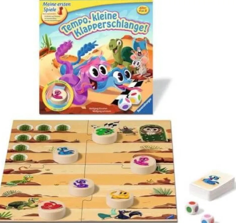 Auf die Plätze…fertig…loooos! Das Wettrennen der kleinen Klapperschlangen durch die Wüste beginnt. Es wird geschlängelt und geklappert, was das Zeug hält! Doch seltsam: Auf der einen Seite klappert eine Schlange und auf der anderen nicht. Für jeden richtigen Tipp gibt’s eine Karte und die Spieler erhöhen so ihre Chance, am Schluss die meisten Gewinner-Klapperschlangen zu besitzen!Sechs bunte Schlangen gehen in Form von Klapperschlangen-Dosen auf das Startfeld bei Stinktier Skip. Einer der beiden geworfenen Farbwürfel wird vom Spieler ausgewählt und bestimmt, welche Klapperschlange vorwärts ziehen darf. Bevor man jedoch die Schlange berührt, rät man, ob sie wohl klappert oder nicht – danach wird sie waagerecht geschüttelt und alle hören gebannt! Stimmt der Tipp, erhält man zur Belohnung eine Klapperschlangen-Karte. Anschließend dreht der Spieler die Dose um und setzt sie ein Feld weiter. Jede Schlange, die vorher geklappert hat, macht dies beim nächsten Mal nicht mehr – und umgekehrt. Wer es sich gut gemerkt hat, wenn die schnellste Klapperschlange das Ziel erreicht, hat die größten Chancen, dass sich Gewinnerschlangen unter seinen Karten befinden!Mit Profi-Variante.