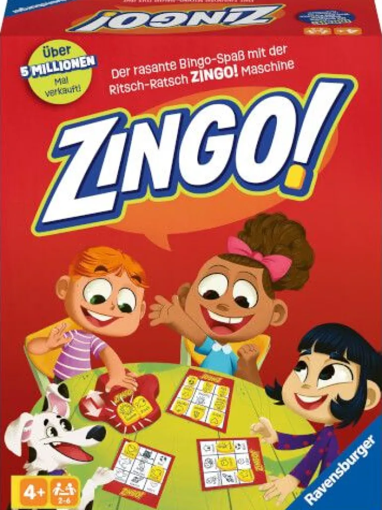 Im rasanten Kinderspiel Zingo! wird schnelle Reaktion mit klassischem Bingo kombiniert. Die Kinder warten gespannt darauf selbst die Zingo-Maschine zu bedienen. Wie durch Zauberhand erscheinen die Kärtchen in der Auslage. Jetzt heißt es schnell sein, denn nur wer zuerst den passenden Begriff ruft, darf das Kärtchen seiner Legetafel zuordnen. Wer zuerst alle Plätze auf seiner Legetafel belegt, gewinnt! Die Kombination aus Worten und Bildern machen Zingo! zu einem spannenden Spiel für jüngere Kinder, aber auch für Erstleser.